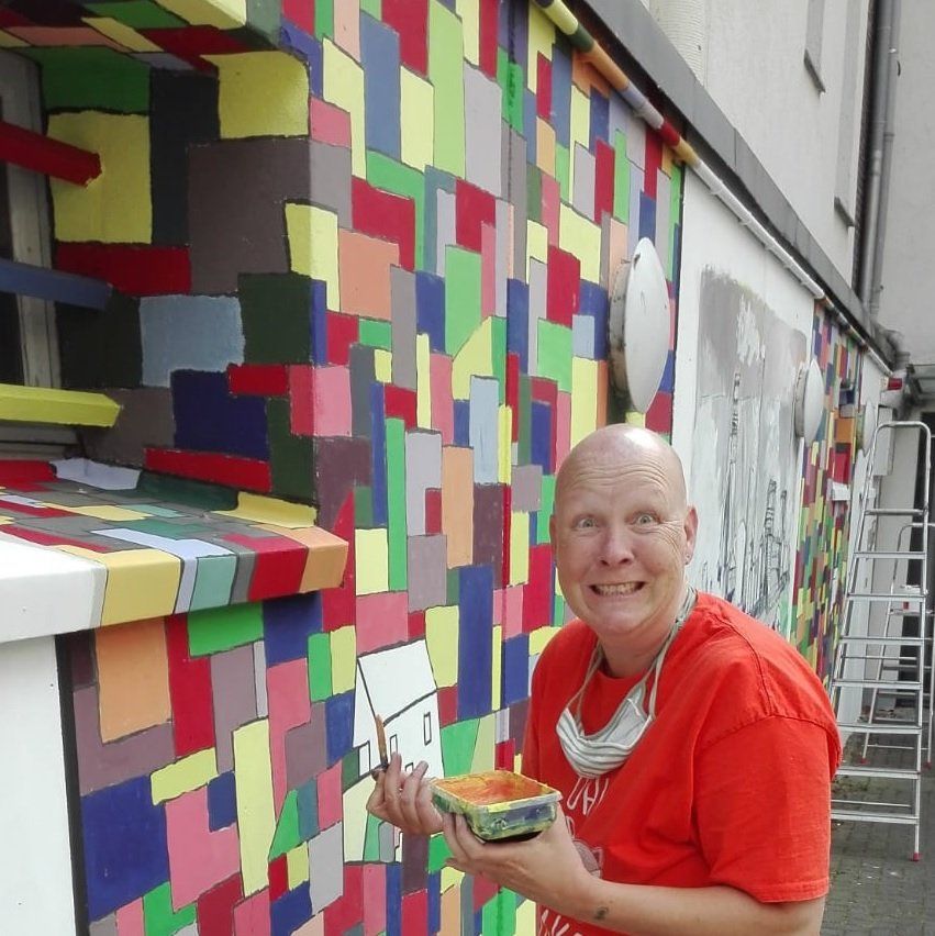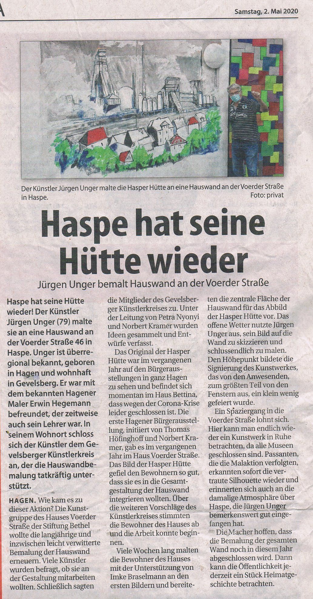 Ob Künstler Jürgen Unger in 9 Tagen (80) in seiner Freiluftbühne, um die Hasper Hütte…Für die Bewohner der Einrichtung wurde Kunst zur Begegnung und baut Brücken in vielfältige Bereiche. Die Künstler der Kunstgruppe des Hauses schufen abseits Ihres Alltags Neues und werden in Ihrem Tun bestätigt. Mitglieder des Gevelsberger Künstlerkreises unterstützen die hauseigene Kunstgruppe tatkräftig bei der Bemalung und eine schöne Erinnerung…