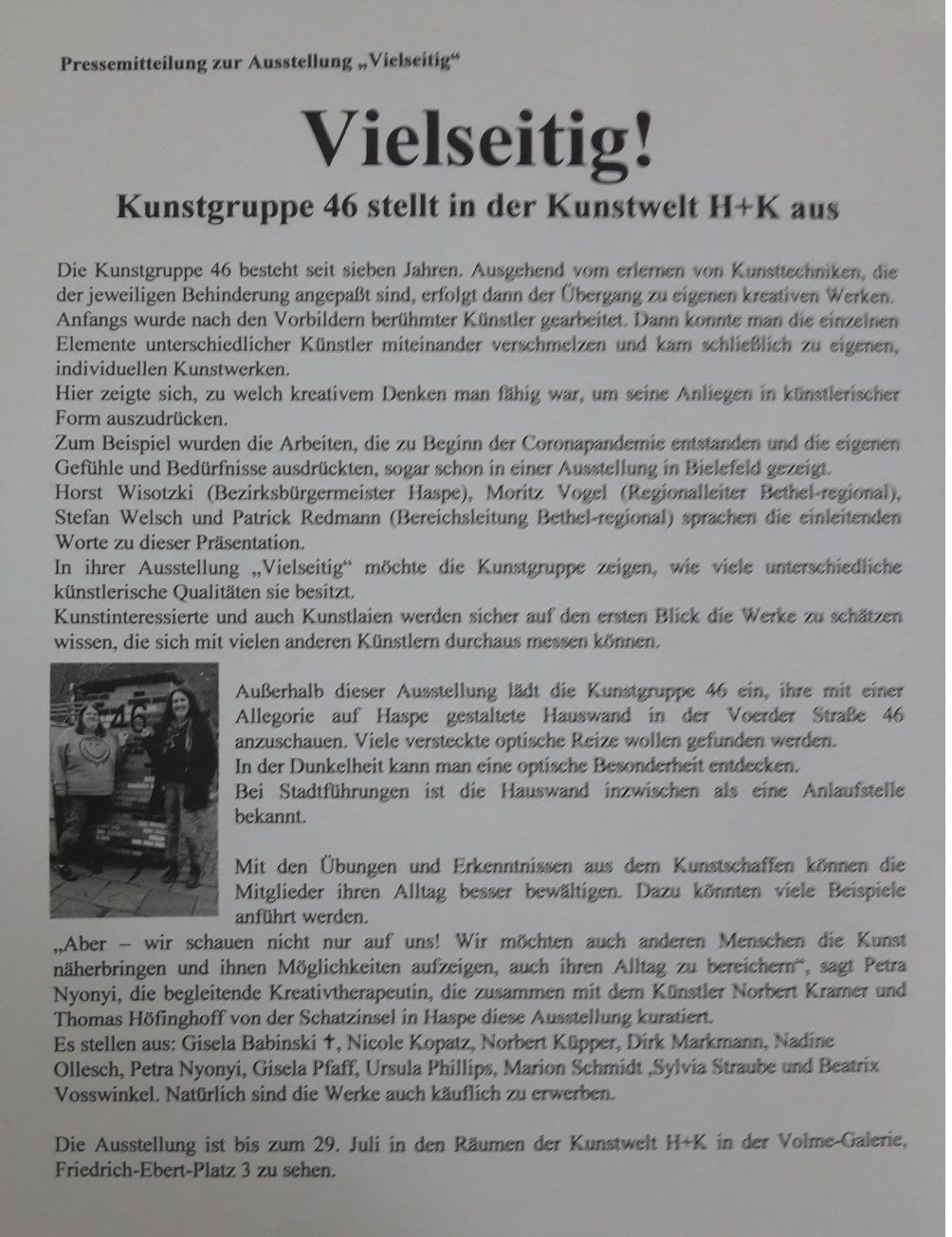 Grußworte sprachen Horst Wisotzki (Bezirksbürgermeister Haspe) Moritz Vogel (Regionalleiter Bethel Regional) Stefan Welsch, Patrick Redmann (Bereichsleitung Bethel Regional)Kuratoren: Petra Nyonyi, Thomas Höfinghoff, Norbert Kramer