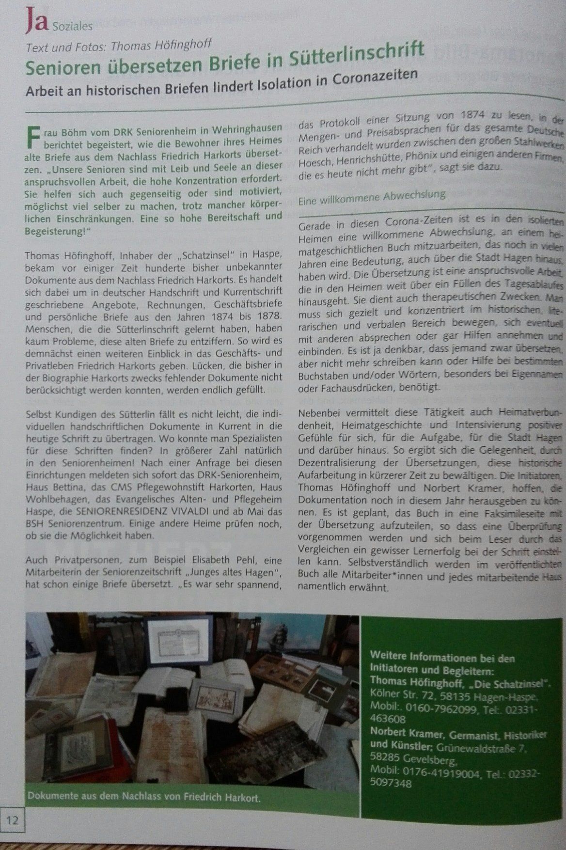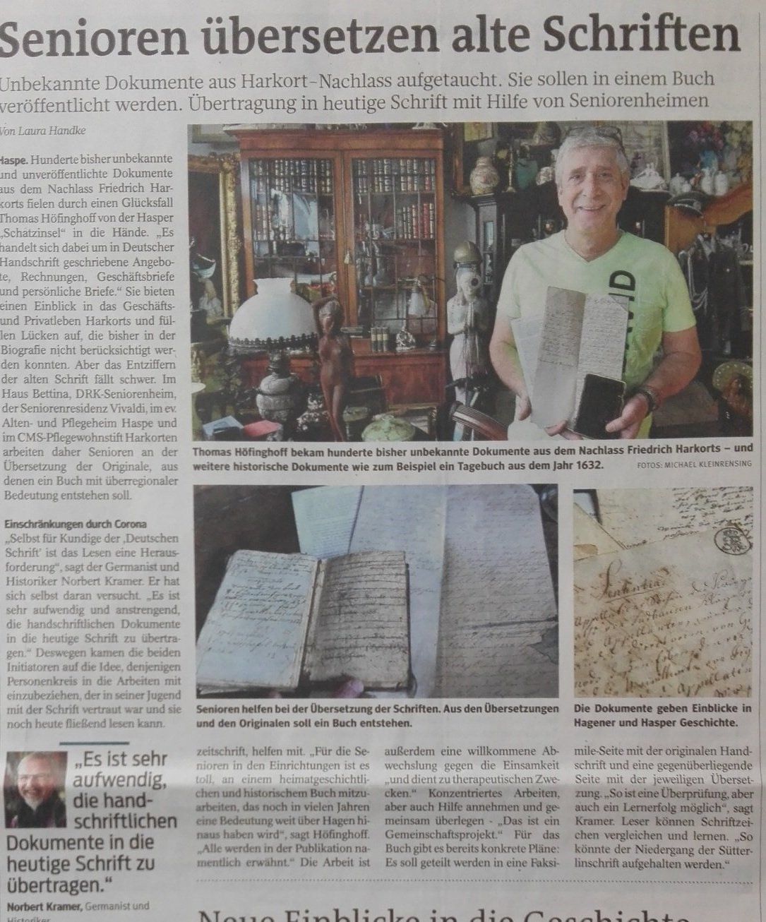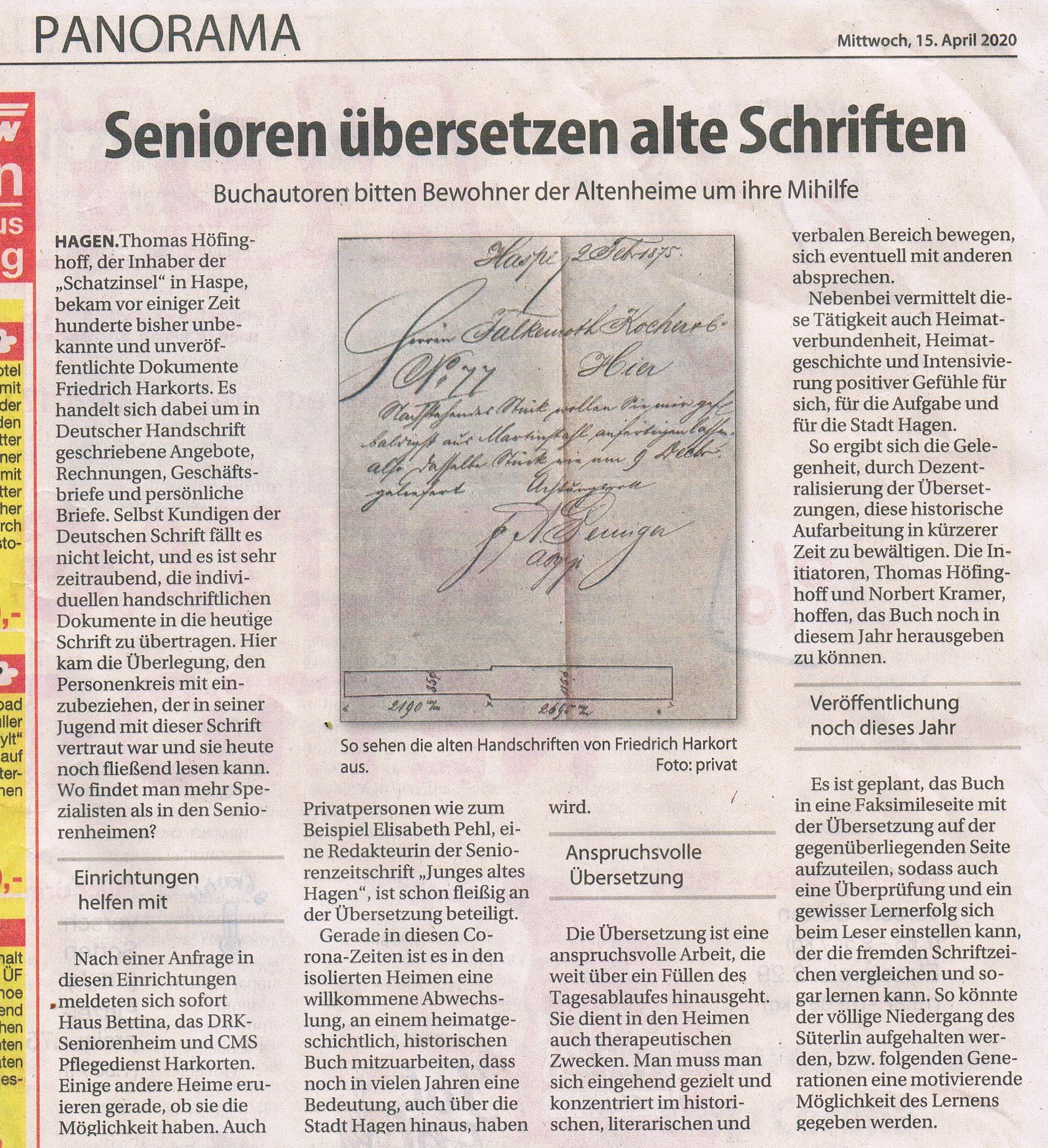 Senioren gegen Corona-Isolation. Die Arbeit an den Briefen aus dem Nachlaß Friedrich Harkorts ist in vollem Gange. Im Pflegeheim Bettina, dem DRK Seniorenheim, das Evangelische Alten- und Pflegeheim Haspe und im CMS Pflegewohnstift Harkorten sind die ersten Briefe bereits usw....