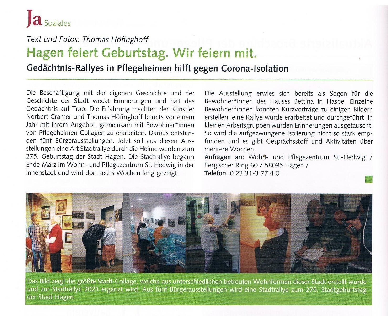 Coronabedingt gibt es zum 275. Stadtgeburtstag der Stadt Hagen die Stadtrallye in der Pflegeeinrichtung und der Theaterbotschaft! Nicht virtuell, nicht real, ganz normal analog. Diese Bürgerausstellung erweist sich gerade unter Corona als Segen für das Heim.