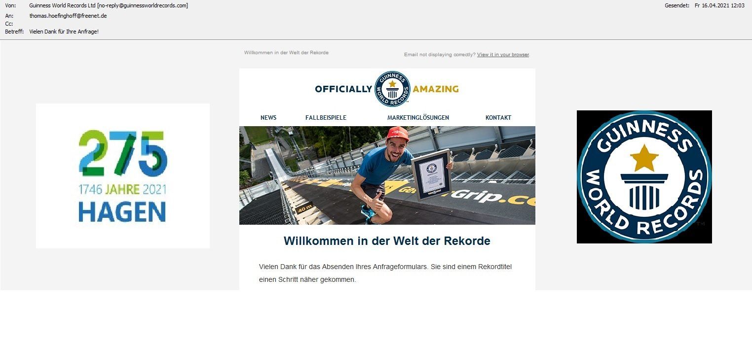 16.04.2021 Antragsstellung Guinessbuch der Rekorde. Hagener Senioren lassen es zum 275. Stadtgeburtstag der Stadt Hagen trotz Corona krachen...Sie haben die größte Stadt-Collage aus unterschiedlichen betreuten Wohnformen erstellt! https://www.guinnessworldrecords.de/